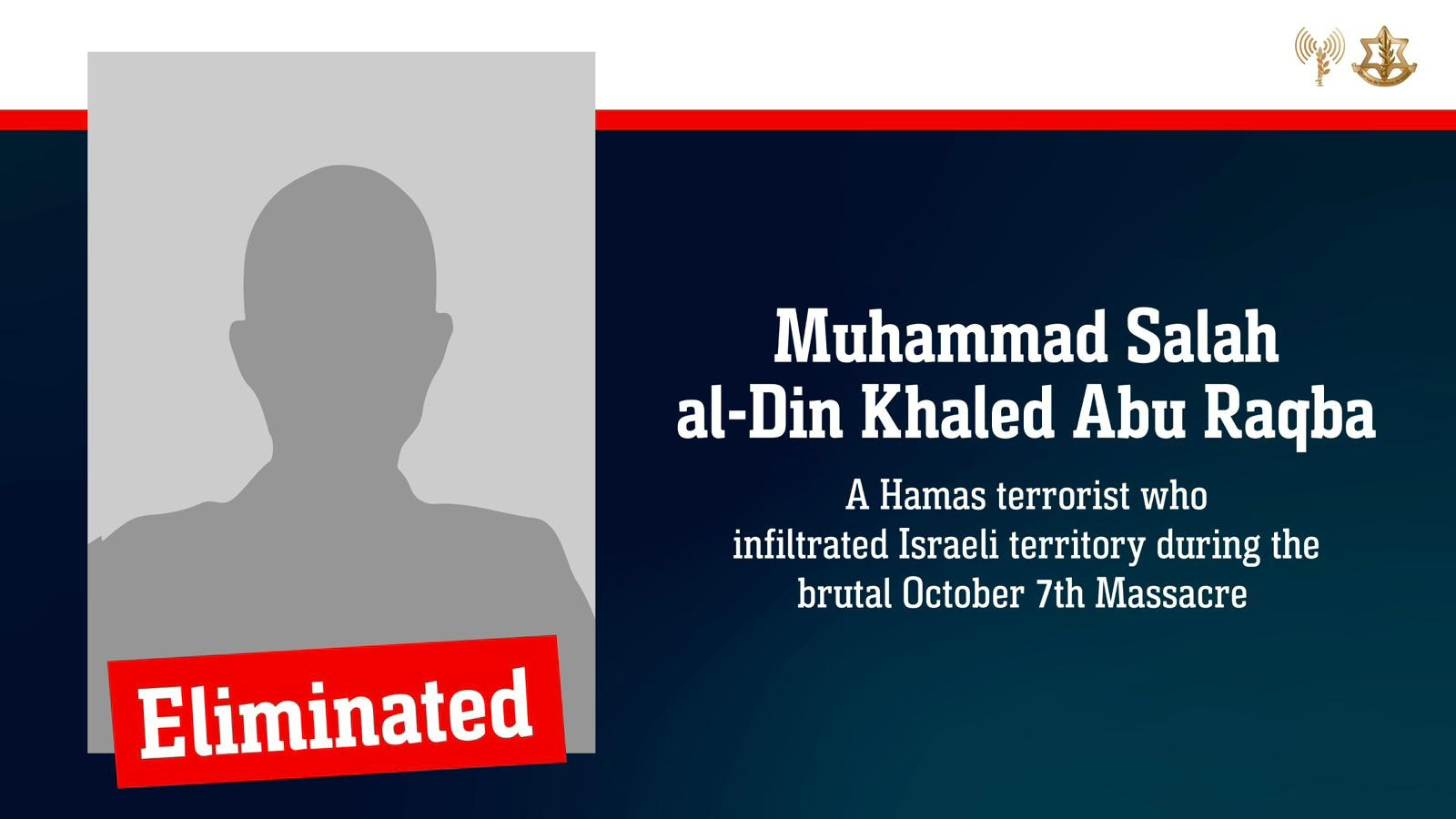 The past Thursday, IDF troops operating in the northern Gaza Strip identified a terrorist near the Yellow Line who approached the troops, posing an imminent threat to their safety. IDF intelligence information suggests the terrorist eliminated is Muhammad Salah al-Din Khaled Abu Raqba, a Hamas terrorist who had infiltrated Israeli territory during the brutal October 7 massacre.