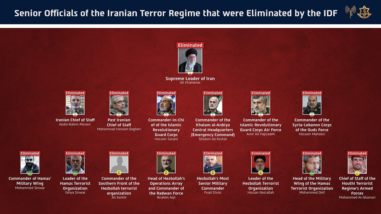 Those eliminated over the course of the campaign include Hezbollah leader Hassan Nasrallah and most of the group’s senior command; Hamas leader Yahya Sinwar and military commander Mohammed Deif alongside much of Hamas’ military leadership; Houthi Chief of Staff Muhammad al-Ghamari; and senior Iranian military figures including IRGC commander Hossein Salami, Armed Forces Chief of Staff Mohammad Bagheri, and Khatam-al-Anbiya commander Gholam Ali Rashid.