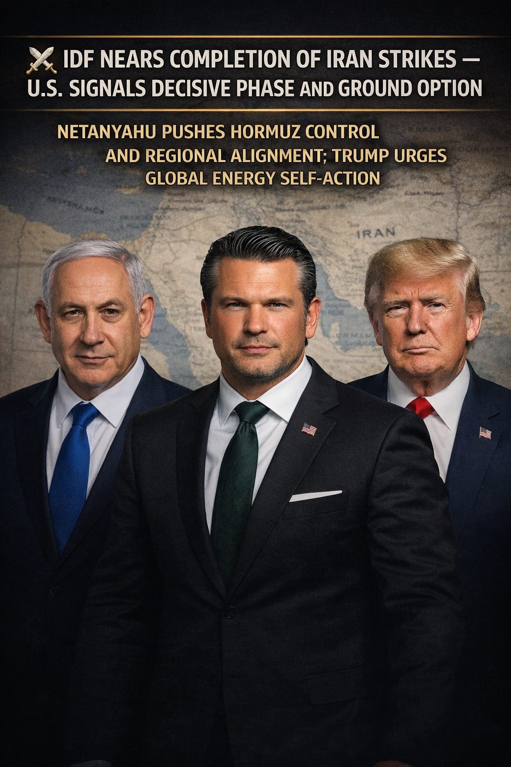 ⚔️ IDF NEARS COMPLETION OF STRIKES ON IRAN’S MILITARY INDUSTRY AS U.S. SIGNALS DECISIVE PHASE AND GROUND OPTION, NETANYAHU PUSHES REGIONAL ALIGNMENT AND HORMUZ CONTROL, TRUMP URGES GLOBAL SELF-ACTION ON ENERGY SECURITY
