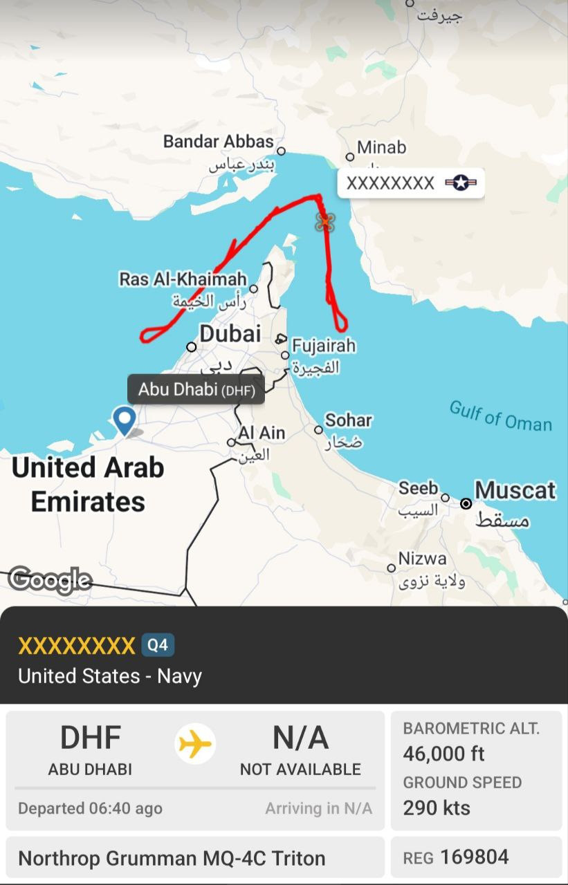 🛰️ MARITIME SURVEILLANCE AND AIRSPACE RESTRICTIONS: A U.S. Navy MQ-4C Triton high-altitude surveillance drone was observed conducting routine maritime monitoring over the Strait of Hormuz and along the UAE coastline at approximately 46,000 feet. The platform is used to track naval movements, air-defense activity, and shipping patterns during sensitive …