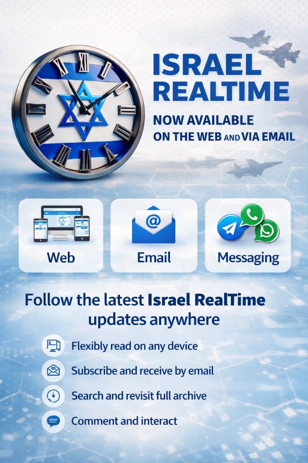 In recent weeks, Israel Realtime has expanded beyond messaging platforms to a full web and email platform. This ensures continuous access to verified updates, searchable archives, and direct delivery โ even during periods of heavy alert activity and high message volume.
