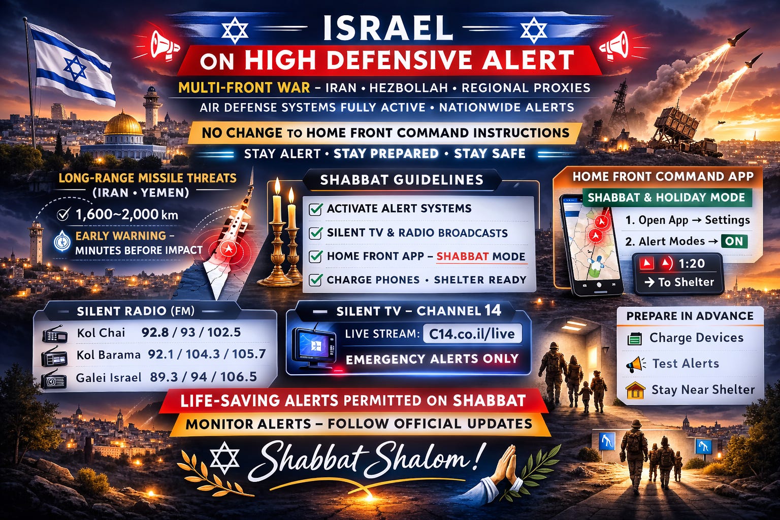 π Preparation guidance: Fully charge your phone before Shabbat and ensure all alert methods β including the Home Front Command app and silent broadcasts β are set up and tested in advance.