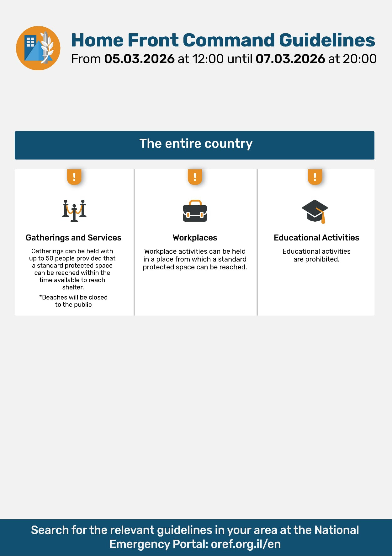 🛡️ Home Front Command updates nationwide defensive guidelines: The IDF’s Home Front Command said the changes take effect on March 5 at 12:00 and remain in place until March 7 at 20:00. Following a situational assessment, all areas of the country will transition from an “essential activity” level to a “limited activity” level.