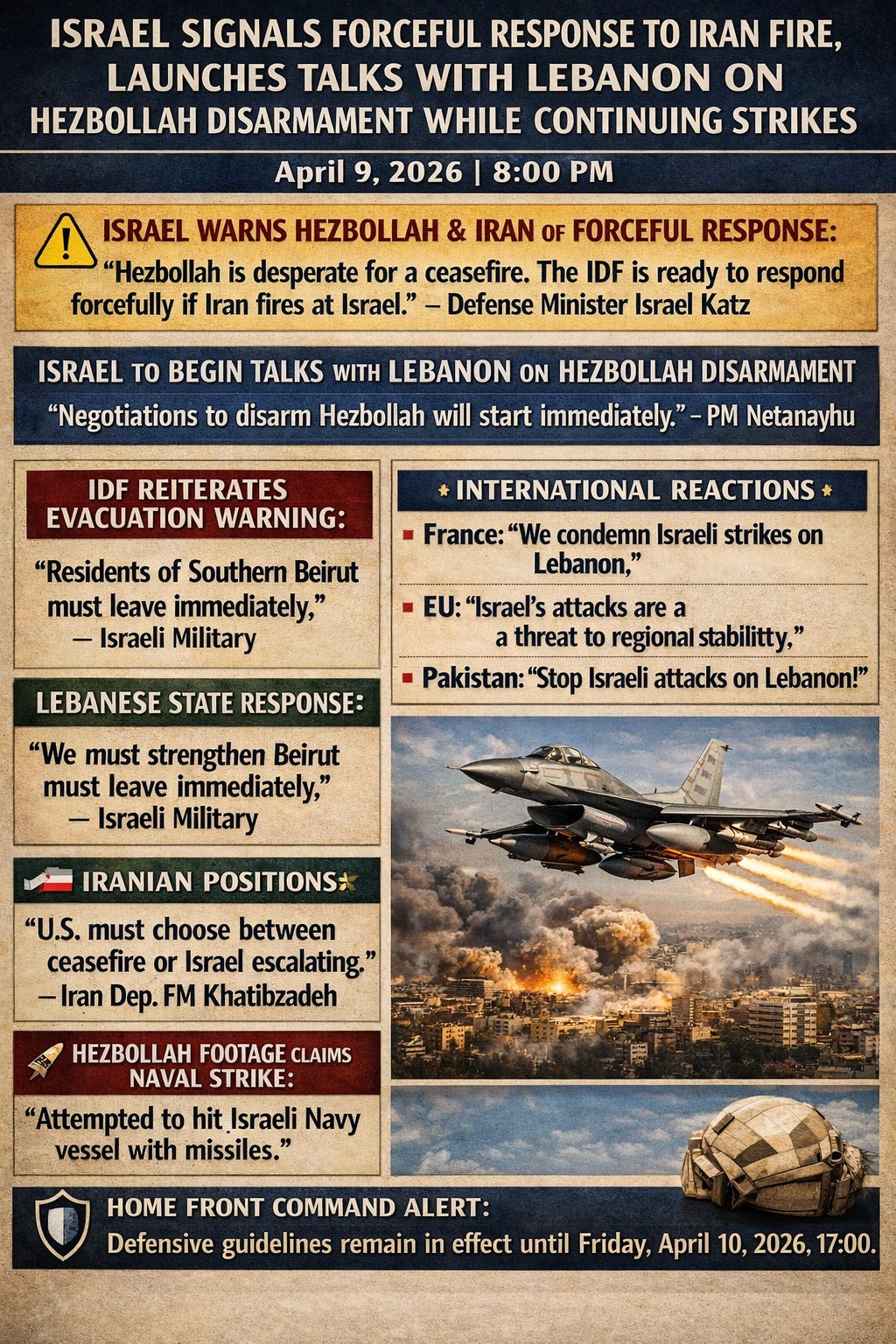 🛡️ HOME FRONT COMMAND MAINTAINS DEFENSIVE GUIDELINES: Following the situational assessment, the Home Front Command defensive guidelines remain unchanged and in effect until Friday, April 10, 2026, at 17:00.