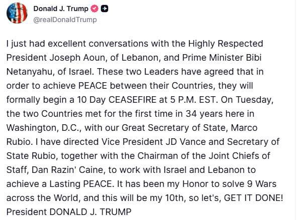🌍 CEASEFIRE FRAMEWORK AND U.S. ROLE: U.S. President Donald Trump stated that Israel and Lebanon agreed to begin a 10-day ceasefire starting Tuesday at 5:00 PM EST following direct discussions with Lebanese President Joseph Aoun and Prime Minister Benjamin Netanyahu. U.S. officials, including Vice President JD Vance, Secretary of State Marco Rubio, and the Chairman of the Joint Chiefs of Staff, were tasked with advancing a longer-term arrangement.