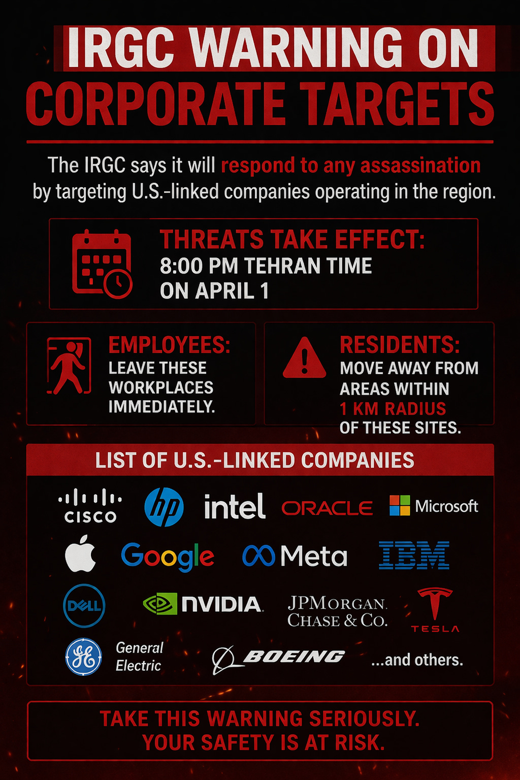 ‼️ IRGC WARNING ON CORPORATE TARGETS: The IRGC says it will respond to any assassination by targeting U.S.-linked companies operating in the region, with threats set to take effect from 8:00 PM Tehran time on April 1.