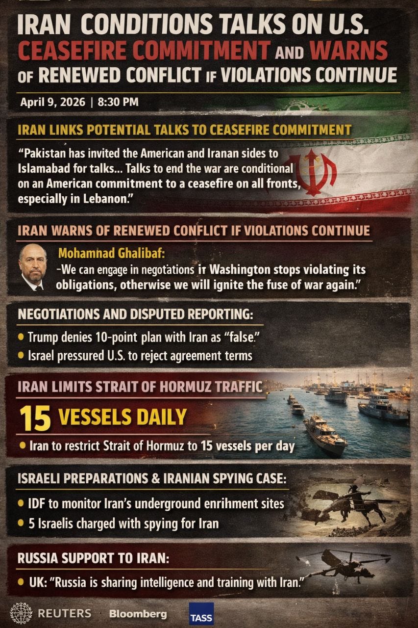 ⚠️ IRAN-PAKISTAN TALKS AND ESCALATION WARNINGS: Iran confirmed participation in talks in Islamabad based on a multi-point proposal, while senior officials warned that further escalation could destabilize the region, even as skepticism persists regarding ceasefire compliance.