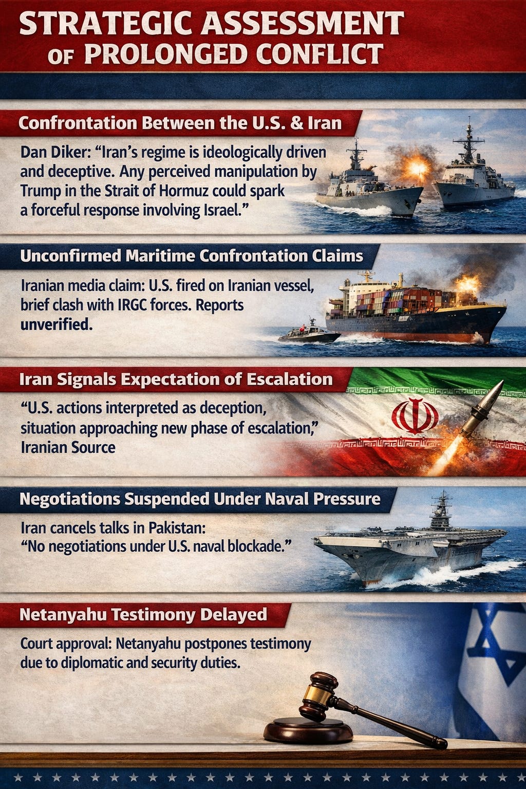🧠 STRATEGIC ASSESSMENT OF PROLONGED CONFLICT: Dan Diker assesses that the confrontation between the United States and Iran reflects a long-running conflict dating back to 1979. He characterizes the Iranian regime as ideologically driven and reliant on deception, and suggests that any perception by Donald Trump of diplomatic manipulation—particularly around the Strait of Hormuz—could trigger a forceful response, with a high likelihood of renewed coordinated military activity involving Israel.